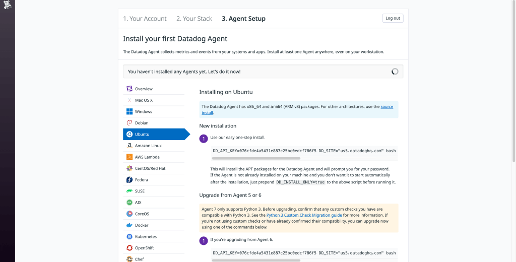 - Install the DataDog Agent on your server. You can do this by following the DataDog Agent Installation Guide.